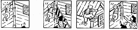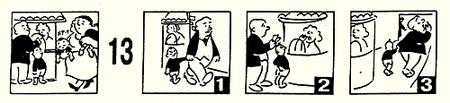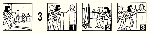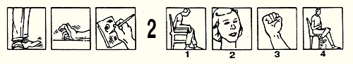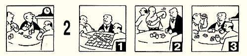 На рисунке слева Барни, зацепившийся за край крыши, испуган и просит помощи у своего маленького сына. Мальчик взволнован тем, что видит отца в таком трудном положении. Выбор рисунка N 1 является правильным ответом в данном случае. Поэтому на Бланке ответов цифра 1 обведена кружком. Рисунок N 1 наиболее логично и правдоподобно продолжает заданную ситуацию: жена и сын Барни приставляют к стене лестницу, для того чтобы помочь ему спуститься. Выбор рисунков N 2 и N 3 является менее корректным. Что касается рисунка N 2, то маловероятно, что, вися в воздухе в таком испуганном и беспомощном состоянии, Барни сможет залезть на крышу самостоятельно. Поскольку положение Барни опасно, жена и сын вряд ли стали бы насмехаться над ним, как это изображено на рисунке N 3. Итак, в каждом задании Вы должны предсказать, что произойдет после ситуации, изображенной на левом рисунке, основываясь на чувствах и намерениях действующих в ней персонажей. Не выбирайте рисунок для ответа только потому, что он показался Вам наиболее забавным продолжением. Предлагайте наиболее типичное и логичное продолжение заданной ситуации. Номер выбранного рисунка (обозначенный в правом нижнем углу рисунка) обходится кружком на Бланке ответов. В самих тестовых тетрадях никаких пометок делать нельзя. На выполнение субтеста отводится 6 минут. За минуту до окончания работы Вы будете предупреждены. Работайте, по возможности, быстрее. Не тратьте много времени на одно задание. Если затрудняетесь с ответом, переходите к следующему пункту. К трудным заданиям можно будет вернуться в конце, если хватит времени. В затруднительных случаях давайте ответ, даже если не совсем уверены в его правильности. Если у Вас есть вопросы, задайте их сейчас. Не переворачивайте страницу, пока не получите команду «НАЧАЛИ!»