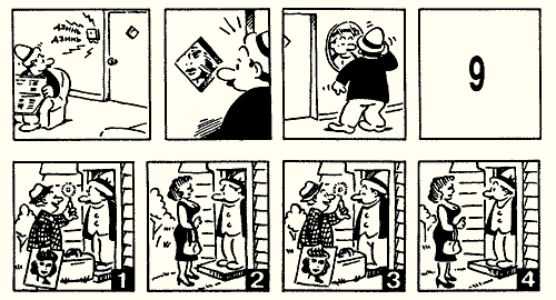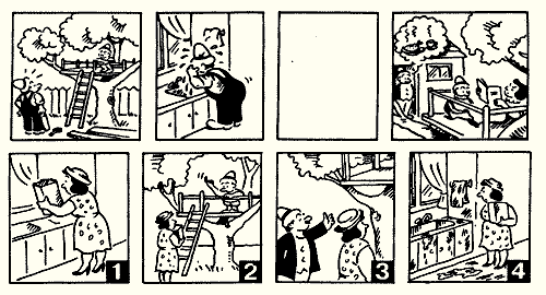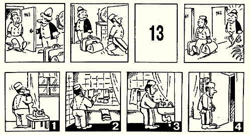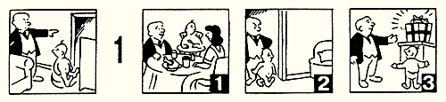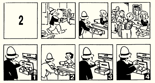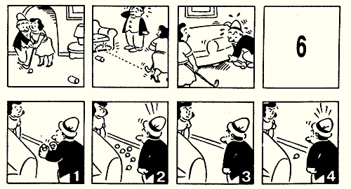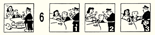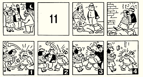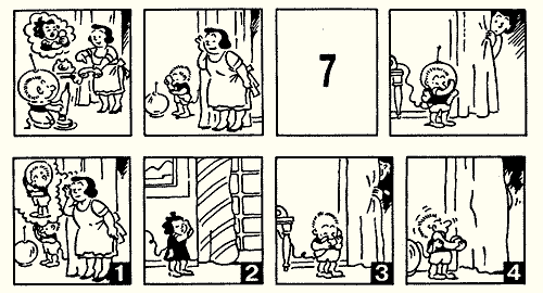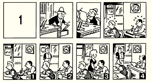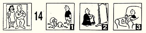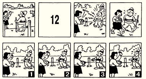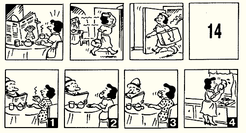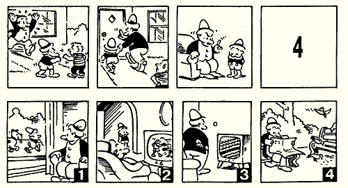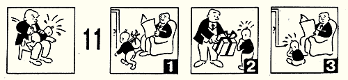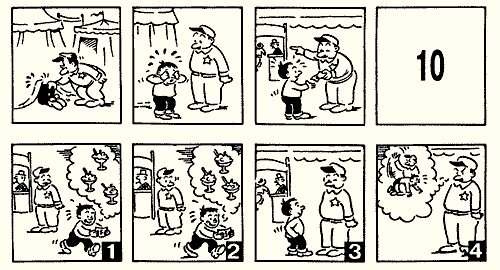 СУБТЕСТ N 4 "ИСТОРИИ С ДОПОЛНЕНИЕМ" В этом субтесте Вы будете иметь дело с картинками, на которых изображены истории про Фердинанда. У Фердинанда есть жена и маленький ребенок. Он работает начальником, поэтому в историях будут также принимать участие его сослуживцы. Каждое задание состоит из восьми картинок. Четыре верхние картинки отражают определенную историю, происходящую с Фердинандом. Одна из этих картинок всегда пропущена. Вам необходимо выбрать среди четырех рисунков нижнего ряда тот, который при подстановке на место пустого квадрата вверху будет дополнять историю с Фердинандом по смыслу. Если Вы правильно выберете отсутствующий рисунок, то смысл истории полностью прояснится, чувства и намерения действующих в ней персонажей станут понятными. Рассмотрим пример: