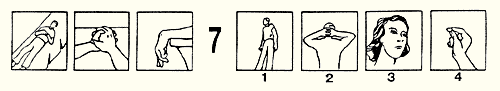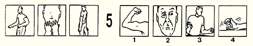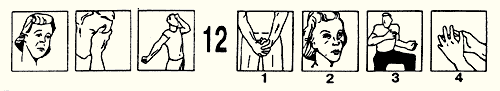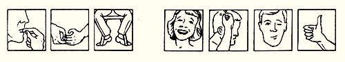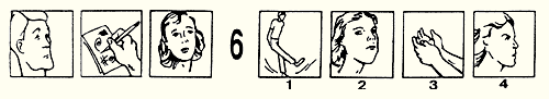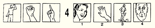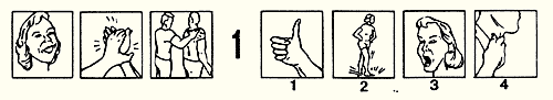 СУБТЕСТ N 2 "ГРУППЫ ЭКСПРЕССИИ" В этом субтесте Вы будете иметь дело с картинками, на которых изображены позы, жесты, мимика, то есть выразительные движения, отражающие состояние человека. Для объяснения сути задания рассмотрим пример. В этом примере три картинки, расположенные слева, иллюстрируют одно и то же состояние человека, одни и те же мысли, чувства, намерения.