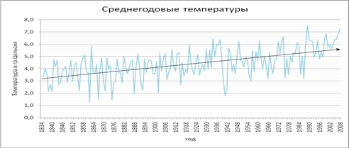 2.1 Построение графиковПо полученным данным я вычислил среднегодовые температуры, для построения графика общего изменения температуры.