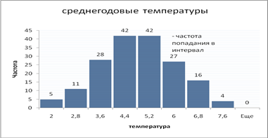 Можно отметить, что в целом температура выше, за исключением 2х лет (2006, 2007) которые отличались холодными зимами (для Санкт-Петербурга) 2.3 Построение гистограмм Для построения первой гистограммы я воспользовался все теми же данными. А для расчета количества интервалов воспользовался коэффициентом Стерджесса.