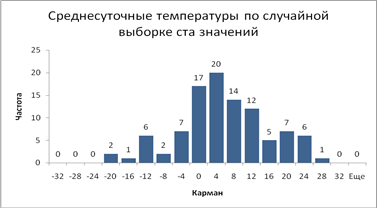 Для построения следующей гистограммы. Я взял другие данные, данные среднесуточной температуры за период с 1834 года по 2009 год. На этот раз подключил пакет анализа в Excel. И с помощью инструмента выборка из данного диапазона случайным способом выбрал 100 значений и построил по ним диаграмму, в которой количество интервалов оставил по-умолчанию ( в т.сл. excel сам выбирает такое значение), а их границы выбрал так чтобы на каждый столбец приходился диапазон в 4 градуса. Результат: