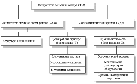Рис. 2.1. Схема факторной системы фондоотдачи Фондоемкость – величина, обратная фондоотдаче. И показывает стоимость ОПФ, приходящуюся на каждый рубль выпускаемой продукции, и определяется по формуле: