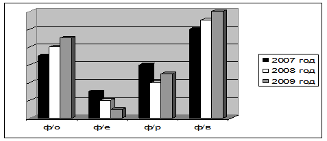 Фондоотдача – это отношение стоимости товарной продукции к среднегодовой стоимости основных средств: 2007 г.: 2008 г.: 2009 г.: Увеличение фондоотдачи говорит о том, что на предприятии увеличилось количество отработанных дней в году, уменьшилось число целодневных простоев оборудования, увеличилось количество и продолжительность смены и увеличилась средняя выработка продукции. Далее определим следующий показатель, характеризующий эффективное использование основных фондов – фондоемкость. 2007 г.: 2008 г.: 2009 г.: Снижение показателя фондоемкости говорит о том, что основные средства использовались эффективнее. Изменение фондоемкости в динамике показывает изменение стоимости ОС на один рубль продукции. Еще один качественный показатель, характеризующий использование основных фондов – фондорентабельность. Этот показатель находится как отношение балансовой прибыли к среднегодовой стоимости основных средств. Балансовая прибыль берется из бухгалтерского баланса (приложения 1–3). 2007 г.: 2008 г.: 2009 г.: Снижение фондорентабельность в 2009 г., по сравнению с 2007 г., говорит о том, что величина прибыли, которую получает фирма с 1 рубля основных средств, уменьшилась. Важным показателем оснащенности предприятия основными средствами является показатель фондовооруженности. Он рассчитывается как отношение среднегодовой стоимости основных средств к среднесписочному количеству работающих на данном предприятии и показывает, сколько основных средств (в рублях) приходится на одного работающего. 2007 г.: 2008 г.: 2009 г.: Увеличение значений показателей фондовооруженности обусловлено увеличением стоимости основных средств в 2009 г. по сравнению с 2007 г. На основе проведенного анализа эффективности использования основных средств составим сводную диаграмму, в которой отразим изменения основных показателей.