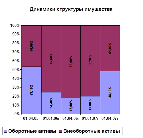 Анализируя данные полугодовой бухгалтерской отчетности ЗАО «Агат» за период с 01.04.2005 г. по 01.04.2007 г. можно сделать вывод, что изменение стоимости имущества за рассматриваемый промежуток времени было нестабильным. На 01.04.2005 имущество организации составляло 115104 тыс. руб. и на 46,9 % состояло из внеоборотных активов, а на 53,1 % - из оборотных. На 01.01.2006 общая стоимость имущества снизилась на 38,49 %, причем наиболее высокими темпами снижались оборотные активы (на 71,74 %), а внеоборотные тоже снизились на 0,81 %. Однако доля внеоборотных активов в их общей стоимости наоборот выросла на 28,7 %. На 01.04.2006 произошло дальнейшее снижение стоимости имущества (на 7,56 %), причем внеоборотные активы выросли на 0,3 %, а оборотные – снизились на 31,9 %. Структурные изменения имущества характеризуются тем, что увеличилась доля внеоборотных активов на 6,4 %. На 01.01.2007 общая стоимость имущества несколько увеличилась (на 3,9 %), причем наиболее высокими темпами увеличивались оборотные активы (на 14,2 %) и на 1,7 % - внеоборотные активы. По структуре на 1,8 % произошло увеличение доли оборотных активов. На 01.04.2007 стоимость имущества опять снизилась на 22,23 %, причем внеоборотные активы снизились на 49,73 %, а оборотные активы повысились на 89,4 %. В структурном отношении на 28,3 % повысилась доля общей стоимости. Таким образом, можно сделать вывод, что за рассматриваемый период наблюдается в основном снижение общей стоимости имущества организации, что нельзя назвать положительной тенденцией.