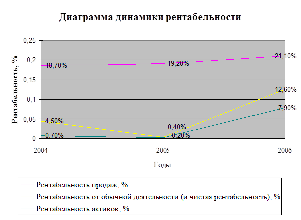 Анализ динамики таких показателей, как рентабельность продаж, рентабельность от обычной деятельности, чистая рентабельность и рентабельность активов за период с 2004 г. по 2006 г. показывает: - рентабельность продаж ЗАО «Агат», несмотря на кризисное финансовое состояние, все-таки увеличивается: за период с 2004 г. по 2005 г. – увеличение произошло на 0,5 %, за период с 2005 г. по 2006 г. – на 1,9 %. В основном наращивание рентабельности продаж происходило за счет повышения цен. Этот способ является временным и недостаточно надежным в нынешних условиях. С целью оздоровления финансового состояния организации необходимо предусмотреть мероприятия по увеличению реализации этой продукции и услуг, необходимость которой определена путем улучшения рыночной конъюнктуры; рентабельность от обычной деятельности и совпадающая с ней по величине чистая рентабельность (по причине отсутствия чрезвычайных доходов и расходов) изменялась: за период с 2004 г. по 2005 г. снизилась на 4,1 %, а дальше пошло увеличение на 12,2 %; рентабельность активов за рассматриваемый период показывает очень нестабильную динамику: за период с 2004 г. по 2005 г. снизилась на 0,5 %, за период с 2005 г. по 2006 г. произошло значительное увеличение на 7,7 %. Это говорит о том, что нет стабильности в динамике использования всего имущества организации. Для улучшения финансового состояния организации необходимо определить пути увеличения прибыльности капитала для увеличения и сохранения стабильности показателя рентабельности активов. Таблица 2.23 Показатели рентабельности