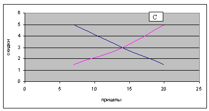 Построим график зависимости реализации прицепов-роспусков от скидок. При соответствии линий предложения и спроса устанавливается равновесная скидка равная 3 % и объем предлагаемой продукции при этой скидки равен 14 шт.