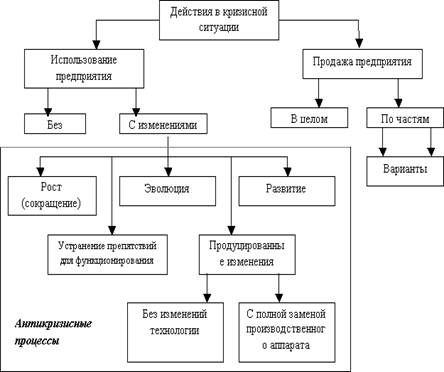 рис.1 Схема взаимодействия бизнес-процессов «Кризис в организации – это процесс изменения, разрушения сложившейся структуры связей, отношений» [Броило Е.В. Механизм рациональных действий в кризисных ситуациях // Вестник Научно-исследовательского центра корпоративного права, управления и венчурного инвестирования Сыктывкарского государственного университета]. Следует различать управление организацией в условиях потенциально возможного и наступившего кризиса. В первом случае должна быть создана система превентивного, предупредительного управления, позволяющая своевременно предвидеть его наступление. Такая система базируется на результатах прогнозирования поведения внешней и внутренней среды (то есть должна учитывать возможность возникновения кризиса не только внутри, но и извне), разработке на основе этих прогнозов долгосрочных и среднесрочных планов и активном контроле, обеспечивающем своевременную нейтрализацию потенциально возможных негативных тенденций. Система превентивного управления должна опережать и предотвращать неплатежеспособность и несостоятельность организации, обеспечивать устойчивое развитие на траектории экономического роста. В условиях наступившего кризиса нужны механизмы, меры, направленные на поиск путей выхода из него, достижение «точки безубыточности». Эти меры можно разделить на оперативные, тактические и стратегические. Вне зависимости от причин возникновения кризиса существуют типовые модели действий в кризисной ситуации (рис.2).