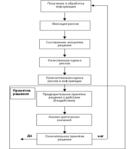 рис. 4 Алгоритм оценки рисков Огромное значение при оценке рисков имеет информация, которая обладает следующими свойствами: ¾ достоверность (корректность) информации ¾ объективность информации ¾ порядок информации (количество звеньев между первоисточником и конечным пользователем) ¾ полнота информации ¾ релевантность ¾ актуальность информации (значимость) Соответственно, чем более информация достоверная, объективная, релевантная и т.п., тем меньше степень риска. «Степень риска — это вероятность наступления случая потерь, а также размер возможного ущерба от него. Риск предпринимателя количественно характеризуется субъективной оценкой вероятной (т.е. ожидаемой), величины максимального и минимального дохода (убытка) от данного вложения капитала. При этом, чем больше диапазон между максимальными минимальным доходом (убытком) при равной вероятности их получения, тем выше степень риска» [Разработка управленческого решения в условиях неопределённости и риска – www.oknemuan.ru]. Оценка рисков состоит из двух этапов: 1) качественная оценка рисков (какие риски влияют на производственно-хозяйственную деятельность) – это позволяет руководителю сразу понять, с какими рисками и в каких сферах деятельности ему придётся столкнуться 2) количественная оценка рисков – «для каждого зафиксированного риска составляется таблица оценки риска на основе данных, полученных из статистических, научных, периодических источников, а также на основе личного опыта руководителей. Данные таблицы оценки риска составлены таким образом, чтобы наиболее полно определить составляющие факторы риска».