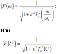 Здесь ωС — частота среза (для фильтра-прототипа она равна 1 рад/с), Тn(U) — полином Чебышева n-го порядка, n — порядок фильтра, ε — параметр, определяющий величину пульсаций АЧХ в полосе пропускания, ωС — частота среза, Полином Чебышева Тn(х) при х<1 колеблется в диапазоне -1... +1, а при х >1 неограниченно возрастает по абсолютной величине. Поэтому АЧХ фильтра Чебышева первого рода в полосе пропускания (при |ω|<ωС) колеблется между значениями Коэффициент передачи на нулевой частоте равен 1 при нечетном порядке фильтра,