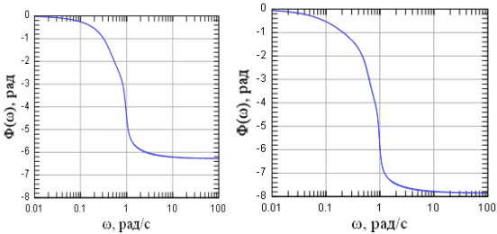 Рисунок 3.2 ФЧХ фильтра Чебышева первого рода 4-го и 5-го порядков соответственно ХГВЗ фильтра Чебышева изображены на рисунке 3.1.3.В полосе пропускания при увеличении порядка фильтра отклоняется от идеальной функции . Это приводит к увеличению вклада фазовых искажений в общее искажение формы выходного сигнала.