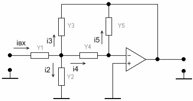 Анализируя выражения передаточной характеристики фильтра, определим типы проводимостей для обеспечения требуемой степени p. Так, сделаем вывод о том, что проводимости Y1, Y2 и Y5 должны заменить резисторы, а проводимости Y3 и Y4 – емкости: