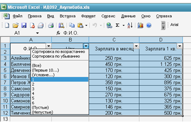 3) Чтобы выполнить фильтрацию, необходимо осуществить следующие действия : Выделяем необходимый столбец (Зарплата в месяц) - Меню -Данные – Фильтр – Автофильтр (ячейка с названием становится списком с кнопкой разворачивания) – Выбираем условие (>100 и<200) - Ок.