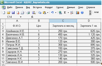4. Работа с базами данных Excel 4.1 Постановка задачи На листе «Базы данных» создать список из не белее 10 записей. Структура одной записи «Заработная плата» Ф.И.О. - Цех – Зарплата в месяц – зарплата 1 кв. Сортировать: Ф.И.О. в алфавитном порядке; Поиск : рабочих одного цеха; Фильтрация: зарплаты от 100 до 200 грн. Выполнить следующие операции над списком: сортировать одного или нескольких полей записи по условию, поиск по критерию, отфильтровать автофильтром и расширенным фильтром из списка только те записи, которые удовлетворяют условию фильтрации, добавлять и удалять записи. 4.2 Основная часть Создаем таблицу. Вводим данные. С веденными данными используем расширенный фильтр и автофильтр.