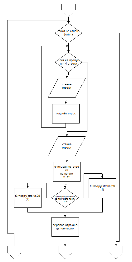Рис.2.6.4-продолжение. Структура алгоритма задачи для структурных схем , выполненных на чертеже формата А1. Для основной программы: Блок1-присваивает значению номера строки еденицу Блок2-организовывает печать меню с выделенной первой строкой Блок3-организует бесконечный цикл Блок4-организует считывание клавиш Блок5-сравнивает код клавиш с кодом enter Блок6-сравнивает код клавиши с 0 Блок7-роганизовывает вызов процедур по номеру строки Блок8-чтение клавиши Блок9-сравнивает код клавиши с кодом стрелки вниз Блок10-привыполнении условия в блоке 9 увеличивает номер текущей строки на 1 Блок11-сравнивает номер строки с его максимальным значением Блок12-сравнивает код клавиши с кодом стрелки вверх Блок13-при выполнении условия в блоке 12 уменьшает значение текущей строки на 1 Блок14- сравнивает номер строки с его минимальным значением Блок15-в случае выполнения условия блока 14 присваивают номеру строки максимальное значение Блоки16,17,18-организуют вызов процедуры печати меню Блоки19-25- организуют вызов процедур, соответствующих номеру строки Блок26-выход из программы. Блок27- при выполнении условия в блоке 11 присваивает значению номера текущей строки минимальное Блок28-вызывает процедуру печати меню. Для процедуры obrabotka: Блок1-присвамивает указателю начальное значение и обнуляет промежуточную величину x. Блок2-создает цикл обхода списка. Блок3 –находит значения поля неоправданных пропусков для каждого эл-та. Блок4-прверяет не равно ли число пропусков 0.Тогда: Блок5-если не равен находит процент пропусков без уважительной причины. Блок6- присваивает значение 0 полю процента пропусков без уважительной причины. Блок7-нахождение промежуточной величины x для дальнейшего нахождения значения поля суммы общих прогулов без уважительной причины. Блок8-нахождение значения суммы общих пропусков без уважительной причины. и перевод указателя на следующий эл-т. Блок9-выводит на экран информацию о том , что обработка данных завершилась. Описание процедур. procedureorg;-организует ввод данных из файла, создание двунаправленного сриска упорядоченного по фамилиям студентов по алфавиту. procedureokno(t:integer);-выводит на экран меню программы. proceduredob;-добавляет нового студента в таблицу ,не нарушая упорядоченности. procedureudal;-удаление элемента. procedurepoisk;-поиск студента по фамилии. procedure obrabotka;-обработка данных по заданию. procedurezapis_v_fail;-сохранение текущей таблицы данных в файл, который укажет пользователь. procedure klavishi(nom:integer);-считывает коды клавишь и позволяет просматривать всю таблицу в процедурах поиска и просмотра. procedure prosmotr_2(x:ukaz);-выводит на экран текущую таблицу со всеми изменениями. Выбор языка программирования. Язык TurboPascalи компилятор выбраны из-за его гибкости, широкого распространения (субъективный фактор), малого объема исполняемого файла и достаточно высокой скорости выполнения. Компилятор BorlandPascal7.0 . к тому же включает в себя опциональную возможность оптимизации кода программы как по скорости, так и по размеру. Основным фактором выбора языка Pascal была его более простая работа со строками. А в данном курсовом пректе это очень важно так как чтение исходных данных производится из текстового файла , данные в котором хранятся в виде таблицы. Этот язык программирования относительно прост, он гибкий и развитый в отношнии типов языка .Язык Си более сложный при написании , поэтому в