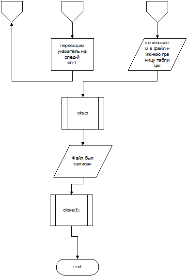 Рисунок 2.6.1 – продолжение. Структура алгоритма задачи для процедуры zapis_v_fail; - сохранение результата в файл (рис. 2.6.2) Блок1-чтение имени файла Блок2-установка связи с файлом Блок3-открытие его в режиме записи Блок4-присвение первого значения указателю Блок5-запись шапки таблицы в файл Блок6-цикл пока не конец списка - Блок7-(конец) запись в файл нижней границы таблицы Блок8-очистка экрана Блок9-вывод на экран информации о том, что файл был записан Блок10-закрытие файла Блок11-конец Блок12запись данных в файл Блок13-первод указателя на следующий элемент