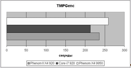 Рис.9 Результаты TMPGenc encoding С конвертированием видео ситуация лучше, около 10% отрыва между соревнующимися. Расстановка сил не претерпела изменений – лидирует Core i7, за ним Phenom II X4, и в хвосте "старичок" 9950.