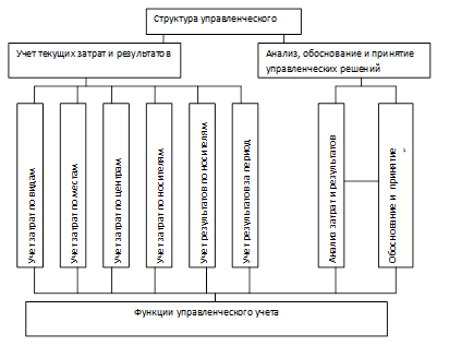 Рис 1.1 Структура управленческого учета Из рисунка видно, что для принятия правильных и обоснованных управленческих решений необходимо произвести анализ затрат и полученных финансовых результатов в текущий момент времени и долгосрочной перспективы, рассмотреть альтернативные варианты развития организации. Выполнение анализа затрат и полученных результатов основывается на учете текущих затрат и результатов. [27.С. 57] Управление затратами – это выполнение всего комплекса функции управленческого цикла, направленных на повышение эффективности использования производственных ресурсов в организации. [23.С. 14] Основными элементами системы управления затратами являются: прогнозирование и регулирование, планирование, организация, нормирование затрат, учет и калькулирование, анализ и контроль за себестоимостью, показано на рисунке 2. [6.С. 97]