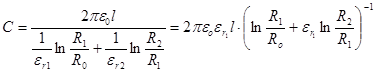 де R0 – радіус внутрішнього електрода, R1 – зовнішній радіус першого діелектричного шару (в нашому випадку картону); R2 – радіус зовнішнього електроду, εr1 – відносна діелектрична проникність першого шару, εr2 = 1, оскільки другий шар – це повітряний зазор. Очевидно, що R1 = R0 + T. Через те, що у перетворювачі, зображеному на рис.9.1, зовнішній електрод охоплює тільки ¼ кола, то, нехтуючи крайовим ефектом, в формулу для ємності слід ввести коефіцієнт 1/4. Якщо в одержаній формулі розрахувати залежність C = f(R1 ), то, використовуючи зв’язок між R1 , R0 , T, одержимо шукану залежність T = f(c). Тоді розрахункова формула матиме вигляд: