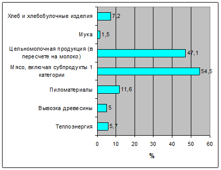 Рисунок 2.- Динамика производства промышленной продукции, работ, услуг в районе В 2007 году рост производства промышленной продукции, работ и услуг в районе составил 12,8% по сравнению с предыдущим годом. В 2008 году было произведено промышленной продукции на сумму 3784 млн. руб., что больше на 2,6%, чем в 2007 году. Высоких результатов достигло ОАО «Марийский завод силикатного кирпича». В 2008 году предприятие произвело более 101,8 млн. штук кирпича, 9,9 млн. штук газосиликатных ячеистых блоков на общую сумму 438,9 млн. рублей, с ростом к 2007 году на 43%. Среднемесячная зарплата одного работника составила в 2008 году более 16 тыс. рублей. 18,3 млн. рублей было вложено в развитие производства. Стабильно работало в 2008 году ЗАО «Краснооктябрьский завод металлических изделий». На переоснащение оборудования предприятием вложено инвестиций около 20,0 млн. рублей. Неплохие результаты по итогам 2008 года можно отметить у ОАО «Марийская мясная компания», которое реализовало промышленной продукции на 291,3 млн. рублей или 118% к уровню 2007 года. Удельный вес района в общереспубликанском производстве основных видов промышленной и продовольственной продукции в 2007 году представлен на рисунке 3.