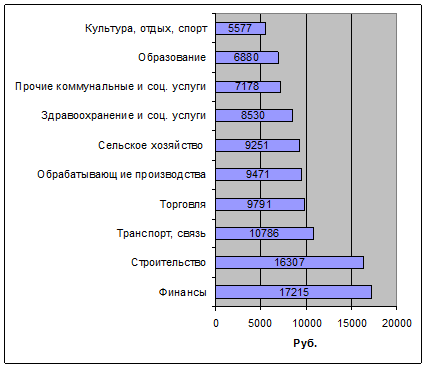 Рисунок 4.- Динамика заработной платы в районе Таким образом, в 2007 году средняя номинальная заработная плата в районе увеличилась на 30% по сравнению с 2006 годом. Средняя номинальная заработная плата, начисленная за 2008 год, составила 9968 рублей и увеличилась по сравнению с 2007 годом на 27,3%. Показатели заработной платы в районе по отраслям экономики в 2008 году представлены на рисунке 5.