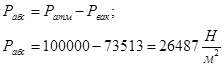 где Рвак – вакуумметрическое давление, кг/м2 Ратм – атмосферное давление, [Ратм =105 кг/м2 ] g– ускорение свободного падения, [g=9,81 Н/кг] h в – высота поднятия жидкости в вакуометре, м ρ – относительная плотность жидкости, кг/м3 Выражаем Рвак