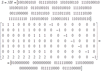 Естественно, все операции должны выполняться по модулю 1024. Для проверки принятого кода на отсутствие ошибок требуется вектор умножить на проверочную матрицу. Проверочная матрица будет иметь следующий вид: