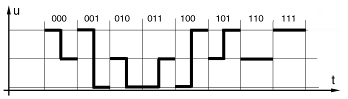 Рис. 3 Рассмотрим вид огибающей для вышерассмотренного примера. Для удобства полученный код запишем в таком виде: 1.001.001.010…0.011.101.010…1.010.100.110…1.110.100.010 1.010.010.110…0.110.100.101…0.101.010.010…1.111.010.010 1.011.010.000…0.111.011.010…1.111.011.101…1.111.110.100 1.100.111.110…1.101.010.010…1.100.011.011…1.101.010.110 Сигнал, проходяший синхронно по четырём парам проводников, изображен на рис. 4.