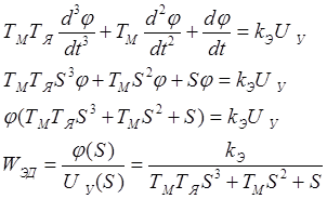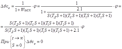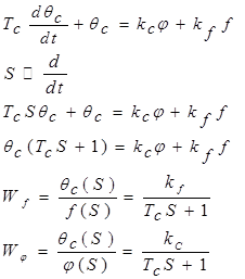 Сигнал разбаланса мостовой схемы (сигнал рассогласования) ΔU = U0 –UД усиливается усилителем 4, выходное напряжение которого Uyуправляет исполнительным двигателем 5. Последний через редуктор 6 перемещает заслонку 3, тем самым изменяет величину регулирующего воздействия φ на входе объекта регулирования. За счет соответствующего изменения угла поворота заслонки и компенсируется отрицательное влияние внешних возмущений f (изменение температуры, влажности атмосферного воздуха и др.), действующих на объект регулирования. При исследовании САР в качестве главного возмущения следует рассматривать изменение температуры атмосферного воздуха, приняв условно, что его влажность не меняется.Динамические свойства элементов САР описываются следующей системой уравнений: