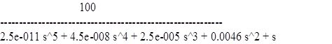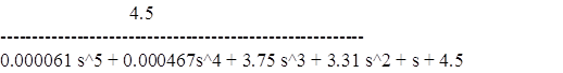 Оценка устойчивости Для оценки устойчивости используем пакет программ MATLAB и его модуль ControlSystemToolbox Задаем передаточную функциюразомкнутой системы >> W=tf([4.5],[0.000061 0.000467 3.75 3.31 1 0]) Transfer function: