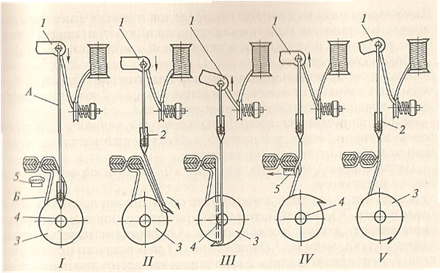 Технологическая схема образования челночного стежка 1 — нитепритягиватель, 2 — игла, 3 — челнок, 4 — шпулька, 5 — механизм перемещения материалов, А — верхняя (игольная) нитка, Б — нижняя (челночная) нитка.4. Техническое обслуживание оборудованияВиды неполадок в работе оборудования. Причины их возникновения и способы устранения.Неполадки в швейных машинах могут возникать по разным причинам: в связи с нарушением взаимодействия механизмов, рабочих органов, износом деталей, изменением чистоты поверхности деталей и т. д. К основным неполадкам швейных машин относятся: низкое качество строчки, обрыв ниток, пропуски стежков, затрудненное перемещение материалов и поломка иглы. Низкое качество строчки. Качество строчки считается низким, если строчка слабая, тугая или загрязненная. Если строчка тугая или слабая, то необходимо увеличить или уменьшить натяжение верхней или нижней ниток. При петлении сверху или снизу необходимо отрегулировать натяжение верхней и нижней ниток, начиная с верхней, если петляет сверху, и с нижней — наоборот. Загрязненная строчка бывает при плохом уходе за машиной, значит, выходом из ситуации считается — своевременный уход за машиной. Пропуски стежков. Пропуски стежков могут происходить при неправильном взаимодействии иглы и челнока. Причинами неправильной работы иглы может быть неправильный подбор иглы для соответствующей машины. Неправильная работа челнока обеспечивается неправильная регулировка челнока. Выявление причин пропусков стежков следует начинать с механизма иглы. Обрыв ниток. Причинами обрыва ниток могут быть неправильная заправка верхней нитки, неотрегулированное натяжение верхней и нижней ниток, несоответствие номеров иглы и ниток и т. п. Исправить это можно, заменив нитки, отрегулировав натяжение, подобрав соответствующие номера игл и ниток. Система планово-предупредительного ремонта, контроль за работой оборудования. Оборудование содержится в исправном состоянии с помощью системы планово-предупредительного ремонта(ППР). Система ППР — это комплекс организационно-технических мероприятий по уходу, надзору, обслуживанию и ремонту оборудования, проводимых периодически по заранее составленному плану. Система ППР предусматривает межремонтное обслуживание, текущий, средний и капитальный ремонт, технические осмотры оборудования. Межремонтное обслуживание осуществляется швеями-мотористками и слесарями-ремонтниками для предупреждения преждевременного износа оборудования (смазка, чистка и т. п.). Текущий ремонт и надзор выполняется слесарем-ремонтником. К нему относятся замена деталей, наладка и регулировка механизмов машин, то есть, решение проблемы по мере её возникновения. Средний ремонт. При среднем ремонте машину разбирают частично, заменяют изношенные детали и т. п. Капитальный ремонт. Это разновидность планового ремонта, при котором происходит полная разборка машины, замена всех изношенных деталей и наладка всех механизмов машины. Технический осмотр машины производят между плановыми ремонтами для проверки качества обслуживания и ремонта машины, наладки всех рабочих органов. Также во время техосмотра разрабатывается график планового ремонта. 5. Мероприятия по устранению опасных и вредных производственных факторов Самым главным мероприятием по устранению опасных 