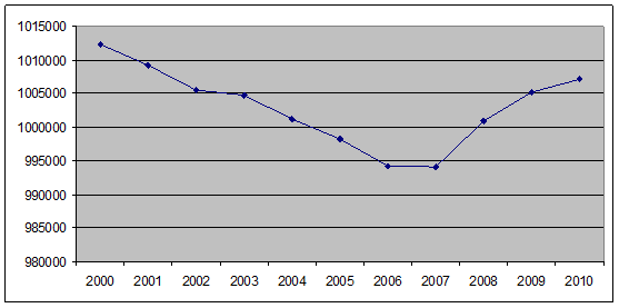 Общая численность на 2009г. составляет 1005241 человек. Вплоть до 2008 года численность населения неизменно падала, основная причина была – это естественная убыль, но за последние 2 года, ситуация изменилась в лучшую сторону. Начиная с 2008г. общая численность населения начинает увеличиваться, это связанно с увеличением рождаемости, уменьшения смертности, особенно детей до 1 года, а так же улучшения качества жизни населения. Коэффициенты смертности и рождаемости Таблица №3[3] Коэффициент рождаемости в Астраханской области.