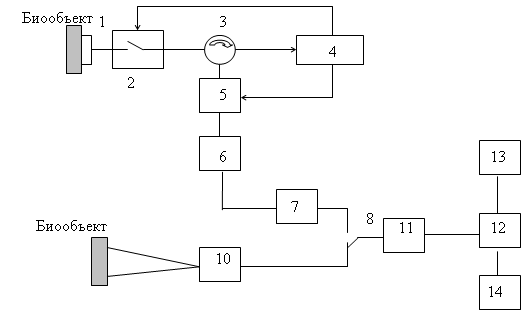 Рисунок 1.4 - Упращенная схема комплекса РТМ-01-РЭС1 – антенна; 2 – выключатель; 3 – циркулятор; 4 – радиометр; 5 – нагреваемый резистор; 6 – генератор опорного напряжения; 7 – усилитель; 8 – переключатель режимов; 10 – инструментальный усилитель; 11 – аналого-цифровой преобразователь; 12 – процессор; 13 – монитор; 14 – принтер. В состав аппаратуры входят: антенна (аппликатор), радиодатчик, датчик температуры кожи, блок обработки информации, персональная ЭВМ (ПЭВМ). Измерение внутренней температуры производится контактным способом. При этом антенна прикладывается к коже пациента на проекции исследуемого органа или его части. Мощность шумового сигнала в радиодиапазоне, поступающая на вход антенны, можно определить по формуле: