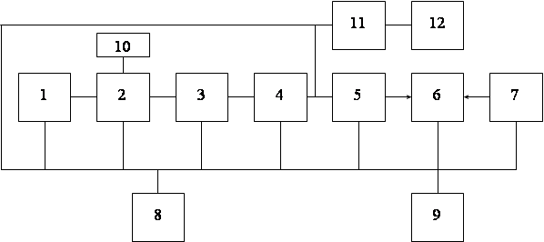 Рисунок 2.1 - Структурная схема дистанционного комплекса контроля функционального состояния 1 – приемник; 2 – дешифратора; 3 – детектора; 4 – усилителя; 5 – усилителя вертикального отклонения; 6 – электронно-лучевой трубки; 7 – задающего генератора горизонтальной развертки; 8 – источника питания; 9 – высоковольтного блока питания; 10 – индикатор; 11 – устройство сопряжения; 12 – компьютер.