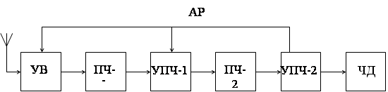 Рисунок 2.2 - Структурная схема приемникаСтруктурная схема приемника представлена на рисунке 2.2. Усилитель высокой частоты, который предназначен для усиления радиосигнала, принимаемого штыревой антенной. Преобразователи частоты ПЧ-1 и ПЧ-2 предназначены для преобразования высокочастотного сигнала в первую и во вторую промежуточную частоту. Усилитель первой и второй промежуточной частоты УПЧ-1 и УПЧ- 2 предназначены для усиления сигнала первой и второй промежуточной частоты, и получения необходимой частоты пропускания приемника. На печатной плате УПЧ-2 выполнена схема автоматической регулировки усиления, которая обеспечивает автоматическое изменение усиления усилителя высокой частоты УВЧ в зависимости от величины входного сигнала. ЧД - детектор предназначен для преобразования высокочастотного сигнала, модулированного по частоте, в импульсную последовательность. Приемник выполнен по супергетеродинной схеме с двойным преобразованием частоты для повышения чувствительности и избирательности, а так же для помехозащищенности системы. Дешифратор 2 предназначен для выделения из последовательности импульсов, модулированных по частоте, первой гармонической составляющей и ее последующего преобразования. Структурная схема дешифратора показана на рисунке 2.3. Усилитель предназначен для усиления сигнала поступившего с приемника. Усилитель-ограничитель предназначен для усиления импульсом, ограниченных по амплитуде на уровне 30 мВ. Это позволяет значительно улучшить помехозащищенность системы. Полосовой фильтр выделяет из импульсной последовательности, модулированную по частоте, первую гармоническую составляющую. Эмиттерный повторитель служит для согласования выходного сопротивления фильтра и входного сопротивления формирователя импульсов, предназначенного для формирования импульсов прямоугольной формы из синусоидального сигнала.