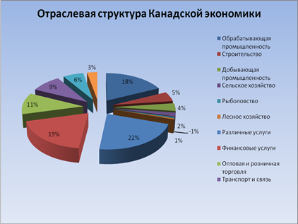 Лесобумажная промышленность использует богатейшие лесные ресурсы. На заготовке древесины Канада занимает 5 место, по производству пиломатериалов и бумаги – 3 место в мире. Еще значительнее роль страны в экспорте по вывозу пиломатериалов и бумаги Канада – мировой лидер. 2/3 бумажно-целлюлозного производства находятся на востоке, вблизи ГЭС на реке Святого Лаврентия. Крупные лесобумажные комбинаты располагаются так же в таежной зоне на севере Степных провинций и, особенно в Британской Колумбии, где сосредоточено 2/3 лесопильной промышленности. 1.3.2 Вторичный сектор Канады Добывающая промышленность. Среди отраслей промышленности Канады выделяется горнодобывающая промышленность, которая отличается исключительным разнообразием производств. Здесь в значительных размерах добывают практически все основные виды полезных ископаемых, необходимые современной индустрии (за исключением бокситов, хрома алмазов и некоторых редких металлов). К началу 80-х годов в Канаде добывалось 26 видов металлов, 24 вида неметаллического минерального сырья, все основные виды минерального топлива. В южной части локализована добыча нефти, природного газа, серы и калийных солей. Широко экспортируется природный газ, нефть и уголь. Канада является одним из крупнейших производителей алюминия, меди, железа, никеля, золота, урана и цинка. Запасы саскачеванского урана являются крупнейшими в мире. Разнообразие и незанятость полезных ископаемых Канады делают её одним из крупнейших мировых экспортёров продукции горнодобывающей промышленности. Однако двумя важнейшими минеральными ресурсами остаются нефть и природный газ. Провинция Альберта обладает значительными запасами этих природных ресурсов и является национальным лидером по их добыче. В Альберте также находятся огромные запасы битума в виде битумных песков. Битум может быть использован для переработки в нефть в условиях растущих цен на нефть. Скачок цен с 2006 породил значительный рост инвестиций и производства «битумной нефти». В будущем, если цены сохранятся на прежнем уровне или продолжат расти, Канада легко могла бы стать одним из крупнейших поставщиков нефти в мире. Восточные провинции импортируют нефть. Значителен экспорт нефти и газа в США. Обрабатывающая промышленность Обрабатывающая промышленность отличается высокой концентрацией производства и капитала, однако по производительности труда уступает другим развитым странам, в частности США. В структуре обрабатывающей промышленности главную роль играют отрасли, непосредственно связанные с сильно развитыми добывающими отраслями, а также сельским и лесным хозяйством. На машиностроение приходится менее 30% продукции и числа, занятых в обрабатывающей промышленности, что ниже, чем в других развитых странах. Бурное развитие канадской обрабатывающей промышленности стимулирует рост внутреннего спроса, начавшийся с 1996 г., причиной которого было в том числе и удешевление кредита. В 1997 г. был зарегистрирован рекордный за предшествующие 14 лет рост частных капиталовложений (на 14%). Рост инвестиций в машины и оборудование составил 20%. До 40% всех инвестиций направлялось в компьютерную отрасль. Несколько скромнее – всего порядка 5% – был рост потребительского спроса. Канада располагает высокоразвитой обрабатывающей промышленностью, занимая одн