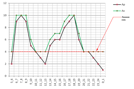 Для дальнейших расчётов выбираем автобус ЛиАЗ-6212, так как себестоимость этого автобуса ниже, чем у автобуса ЛиАЗ-5256, что подтверждает графическое изображение. Графоаналитический метод по определению рациональной организации работы автобусов и труда водителей В качестве исходного материала данного метода служит диаграмма потребности в автобусах по часам суток. Целью графоаналитического метода является определение минимально необходимого набора режимов работы автобусов и водителей на маршруте при достижении наименьших общих затрат (машино-часов) с учетом ограничений, определяющих те или иные нормативы (продолжительность смен водителей, предоставление обеденных перерывов, сменность и т.д.). На первом этапе графоаналитического метода определяем: – линию «максимум», соответствующую максимальному количеству выпускаемых автобусов Аmax ; – зоны обеденных перерывов В1 и В2, равные В1 (В2 ) = Аmax (0.5…2), ч; – зону межсменного отстоя С; – транспортную работу в автобусо-часах (Ач). Определение рационального времени для обеденных перерывов и отстоев автобусов выполняется графически. Обеденные перерывы обычно предоставляются после окончания часов пик. Набор фонда времени на обеденные перерывы водителей утренних смен следует производить не позднее 5 часов после выхода последнего автобуса, а для водителей вечерних смен не позднее, чем за 4–5 часов до окончания работы автобусов на маршруте. На втором этапе определяется общее количество машино-смен равное: