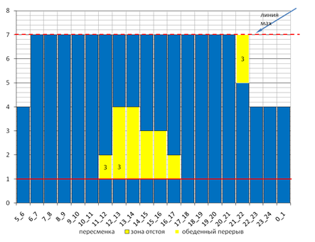 Классификация автобусов по сменности определяется по выражению: ΔАм = ∑АС – 2*Аmax , где ΔАм – количество автобусов, продолжительность работы которых отличается от продолжительности работы автомобилей с двухсменным режимом работы. ΔАм = 15 – 2*7 = 1 Примечание. Если: ΔАм >0 – по абсолютной величине это значение соответствует количеству автобусов, имеющих трехсменный режим работы; ΔАм <0 – по абсолютной величине это значение соответствует количеству автобусов, имеющих односменный режим работы; ΔАм = 0 – все автобусы имеют двухсменный режим работы. На третьем этапе графически перестраиваем зоны «В1», «В2» и «С» таким образом, чтобы каждому водителю был предоставлен обеденный перерыв с учетом норм, а разнообразие режимов работы автобусов по продолжительности было минимальным.