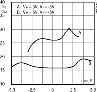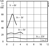 Рисунок 8. Зависимости Ro КМОП-ключа от входного напряжения при однополярном включении для различных значений питающего напряжения Имеются различные приемы, которые разработчики ИМС аналоговых коммутаторов применяют, чтобы сохранить значение Ro малым и примерно постоянным во всем диапазоне изменения входных сигналов. Это нужно для уменьшения нелинейных искажений входного сигнала. Для этого схему управления ключом выполняют таким образом, чтобы напряжение n-подложки "следило" за напряжением входного сигнала. Применение транзисторов с малым напряжением отсечки и повышенной крутизной позволяет построить коммутаторы с весьма малым Ro при низком питающем напряжении. Так например, одноканальный ключ ADG701 при однополярном питании +5 В имеет сопротивление Ro не более 2,5 Ом. На рисунке 9 приведены зависимости сопротивления открытого ключа низковольтной микросхемы МАХ391 от напряжения входного сигнала для различных питающих напряжений при однополярном (а) и разнополярном (б) питании.