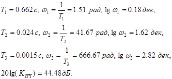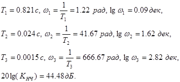 Таким образом, Для того чтобы входное воздействие воспроизводилось с ошибкой, не превосходящей динамическую ошибку, ЛАЧХ системы не должна попадать в запретную область. По рис. 2.8 можно сделать вывод о выполнении требования ТЗ по качеству системы в установившемся режиме, т.к. при минимальном и максимальном значениях электромеханической постоянной двигателя Среднечастотный участок определяет устойчивость и запасы устойчивости системы, а, следовательно, и качество системы в переходном режиме. Для построения среднечастотного участка будем использовать методику Бесекерского [3, с. 369]. Для определения левой и правой границ среднечастотного участка используются неравенства: