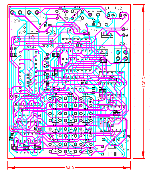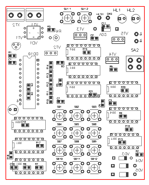Рис. 2. Разводка печатной платы. 3. Перечень элементов P-CAD Component and Net Attributes C:\...\Плата.PCB ====================================================== RefDes Type Value --------------- --------------- --------------- +4.5V 15 24 15 GND C1 C0805 C2 C0805 0.022mk C3 C0805 0.022mk C4 K50-35-25V-10U 10mk C5 C0805 45mk C6 C0805 220 C7 C0805 0.047mk C8 C0805 0.1mk C9 C0805 270 C10 C0805 0.047мк C11 C0805 0.047мк C12 C0805 0.047мк DD1 К561ЛА7 DD2 К561ТМ2 DD3 К561ЛЕ5 DD4 К561КТ3 DD5 К561ЛЕ5 DD6 К561ТМ2 DD7 К561ИЕ16 DD8 К561ТМ2 DD9 К561ИЕ8 DD10 KR1008VJ1 KR1008ВЖ1 HL1 АЛ307Б HL2 АЛ307Б R1 SMD0805 220k R2 SMD0805 220k R3 SMD0805 3k R4 R05W_VERT 270 R5 SMD0805 56k R6 SMD0805 300k R7 SMD0805 820k R8 SMD0805 56k R9 SMD0805 22k R10 SMD0805 22k R11 SMD0805 100k R12 SMD0805 100k R13 SMD0805 56k R14 SMD0805 56k R15 SMD0805 R16 SMD0805 5.5k R17 SMD0805 820 R18 SMD0805 100k R19 SMD0805 820 R20 SMD0805 56k R21 SMD0805 270k SA1.1 SAA-2 SA1.2 SAA-2 SA2 SB2 SB1 SAA-2 SB2 SAA-2 SB3 SAA-2 SB4 SAA-2 SB5 SAA-2 SB6 SAA-2 SB7 SAA-2 SB8 SAA-2 SB9 SAA-2 SB10 SAA-2 SB11 SAA-2 SB12 SAA-2 VD1 KC407A VD1 VD2 КД522А VD3 КС139А VD4 КД522А VD5 КД522А VT1 KT503 KT503 VT2 KT815 KT815 VT3 KT315 VT3 VT4 KT361 VT4 VT5 KT315 VT5 X5 15 X6 15 XT1 BT2A XT2 BT2A NetName Width --------------- --------------- +5V 0.8mm GND 0.8mm 4. Программа для сверлильного станка M48 ;FILE_FORMAT=4:2 METRIC,TZ,0000.00 ;TYPE=PLATED T01C0.60 T02C0.80 T03C0.97 T04C1.00 T05C1.10 T06C1.17 T07C1.50 % T01 X+13300Y+8700 X+13550 X+13800 X+14050 X+14300 X+14550 X+14800 Y+7950 X+14550 X+14300 X+14050 X+13800 X+13550 X+13300 Y+10200 X+13550 X+13800 X+14050 X+14300 X+14550 X+14800 Y+9450 X+14550 X+14300 X+14050 X+13800 X+13550 X+13300 X+13350Y+7200 X+13600 X+13850 X+14100 X+14350 X+14600 X+14850 Y+6450 X+14600 X+14350 X+14100 X+13850 X+13600 X+13350 X+7850Y+5750 X+8100 X+8350 X+8600 X+8850 X+9100 X+9350 Y+5000 X+9100 X+8850 X+8600 X+8350 X+8100 X+7850 X+7800Y+8150 X+8050 X+8300 X+8550 X+8800 X+9050 X+9300 Y+7400 X+9050 X+8800 X+8550 X+8300 X+8050 X+7800 X+10850Y+12350 X+11100 X+11350 X+11600 X+11850 X+12100 X+12350 X+12600 Y+11600 X+12350 X+12100 X+11850 X+11600 X+11350 X+11100 X+10850 Y+11050 X+11100 X+11350 X+11600 X+11850 X+12100 X+12350 X+12600 Y+10300 X+12350 X+12100 X+11850 X+11600 X+11350 X+11100 X+10850 X+10950Y+9900 X+11200 X+11450 X+11700 X+11950 X+12200 X+12450 Y+9150 X+12200 X+11950 X+11700 X+11450 X+11200 X+10950 X+7850Y+6950 X+8100 X+8350 X+8600 X+8850 X+9100 X+9350 Y+6200 X+9100 X+8850 X+8600 X+8350 X+8100 X+7850 T02 X+7800Y+8650 X+7500 X+13816Y+13896 X+14092Y+13902 X+14616Y+13896 X+14892Y+13902 T03 X+11800Y+12950 X+11550 X+11300 X+13650Y+11550 X+13400 X+13150 X+7704Y+12400 X+7829Y+12250 X+7954Y+12400 X+8350Y+13350 Y+13100 Y+12850 X+9350 Y+13100 Y+13350 X+9100Y+11500 Y+11246 Y+10992 Y+10738 Y+10484 Y+10230 Y+9976 Y+9722 X+8084 Y+9976 Y+10230 Y+10484 Y+10738 Y+10992 Y+11246 Y+11500 X+9100Y+9468 Y+9214 X+8084 Y+9468 X+9100Y+8960 X+8084 X+14000Y+12700 X+13750 X+13500 X+9850Y+11900 X+10100 X+9600 T04 X+14700Y+4900 X+13430 X+9820Y+12790 X+10150Y+12800 X+14700Y+5400 X+13430 X+12400Y+13300 X+13670 T05 X+12650Y+13950 X+13150 X+14800Y+12600 Y+13000 X+11025Y+5075 X+11675 X+11021Y+5525 X+11675 X+10025Y+5075 X+10675 X+10021Y+5525 X+10675 X+10025Y+8075 X+10675 X+10021Y+8525 X+10675 X+11025Y+8075 X+11675 X+11021Y+8525 X+11675 X+11025Y+7075 X+11675 X+11021Y+7525 X+11675 X+10025Y+7075 X+10675 X+10021Y+7525 X+10675 X+10475Y+13725 X+11125 X+10471Y+14175 X+11125 X+11475Y+13725 X+12125 X+11471Y+14175 X+12125 X+11025Y+6075 X+11675 X+11021Y+6525 X+11675 X+10025Y+6075 X+10675 X+10021Y+6525 X+10675 X+12025Y+5075 X+12675 X+12021Y+5525 X+12675 X+12025Y+8075 X+12675 X+12021Y+8525 X+12675 X+12025Y+7075 X+12675 X+12021Y+7525 X+12675 X+12025Y+6075 X+12675 X+12021Y+6525 X+12675 T06 X+14500Y+5850 X+13484 T07 X+8052Y+14094 X+7552 X+9152 X+8652 X+14948Y+11494 Y+11094 X+14448Y+11494 Y+11094 T00 M30 5. Программа для фотоплоттера
