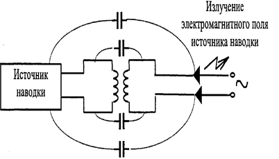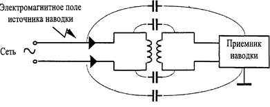 Сеть Эти виды распространения наводок по сети питания являются ассиметричными или однопроводными, поскольку оба провода сети питания передают сигнал наводки в одном направлении. Обратным проводом является земля. Симметричное распространение наводки имеет место в случае, когда на проводах сети индуцируются различные напряжения относительно земли. Между проводами образуется высокочастотная разность потенциалов, и по проводам сети проходят токи наводки в разных направлениях. В приемнике наводки индуцируются равные по величине и обратные по знаку напряжения, которые не могут проникнуть в высокочастотную часть приемника и не являются опасными.