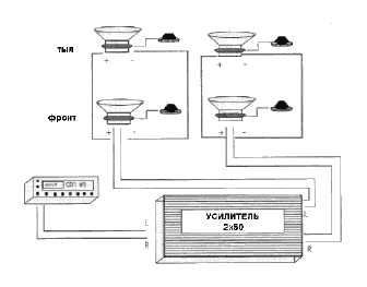 Рисунок 1. Схема с двумя двухканальными усилителями. На рисунке 2 показана схема усиления низкочастотного спектра звукового сигнала отдельно от среднего и высокочастотного диапазонов, разделенных электронным кроссовером. Так как сабвуфер имеет К.П.Д. меньший, чем высокочастотный динамик, он потребляет больше мощности от усилителя, чем последний, для создания равного звукового давления. Усиливаясь в одном усилителе, низкие частоты отбирают большую часть мощности и практически ничего не оставляют для средних и высоких частот, которые начинают плохо вырисовываться в звуковой картине. Увеличение громкости для "вытягивания" средних и высоких приводит к искажениям в области низких частот. Звуковая картина окончательно портится. Если же усиливать низкие частоты отдельно от остальных, то мы имеем великолепную возможность сделать средние и высокие частоты достаточно громкими и яркими, не искажая низкочастотную составляющую сигнала. Звуковая картина становится четкой, а эффективность системы значительно возрастает. К примеру, если мы имеем усилитель для сабвуфера мощностью 60 Вт, то для хорошего звука в салоне для средне- и высокочастотных динамиков достаточен отдельный усилитель мощностью лишь в 20 Вт. Если кроссовер правильно настроен, то есть каждый усилитель получает свою порцию частотного диапазона, то потенциальный уровень звукового давления (SPL) этой системы будет эквивалентен мощности 150 Вт, а не 80 Вт (60 Вт + 20 Вт).