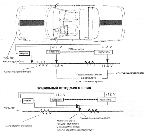 Рисунок 9 Диагностика источника шума I. Отсоедините головное устройство от аудиосистемы. Если шум прекратился - заземлите головное устройство в общую точку на корпусе, куда заземляются остальные компоненты системы. II. Если шум не исчез, и если компоненты заземлены в разных местах на корпусе автомобиля, то, пользуясь цифровым мультиметром (ЦММ), замерьте напряжения между отрицательным терминалом аккумулятора и точками заземления каждого компонента. Если Вы обнаружили разницу в показаниях(рисунок 10), то необходимо уравнять уровень сигнала между компонентами, заземлить все компоненты в одном месте на корпусе, или найти другое место на кузове для "земли" компонента, напряжение которого отличается от других показаний. Уровень сигнала между компонентами должен быть одинаковым. Показания уровня сигнала между компонентами снимаются с экранов RCA кабелей во всех возможных комбинациях между компонентами аудиосистемы. III. Если же разницы в показаниях ЦММ нет, то причина шума, скорее всего в следущем: - RCA провода расположены в непосредственной близости к силовым проводам или RCA провода плохого качества. - акустические провода проложены параллельно силовому кабелю или пересекают его под углом меньше 90 градусов; - акустический провод имеет контакт с кузовом автомобиля; - корпус усилителя не изолирован от кузова автомобиля; - антенна плохо заземлена и создает контур.