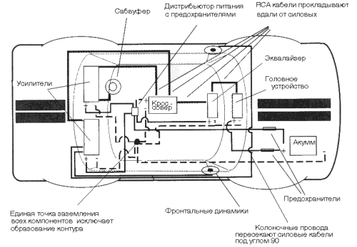 Рисунок 11. Места обязательной шумовиброизоляции Нам понадобится два вида материалов: «Вибропласт» - для виброизоляции и «Визомат» - для шумоизоляции. Толщину материалов выбираем исходя из конструктивных особенностей дверей. Проклейку можно проводить при температуре окружающей среды +15, либо при использовании строительного фена. Разбираем дверь. На внутреннюю поверхность внешней панели двери наклеиваем вибропласт, кусками приблизительно по 15х30 см. Швы располагаем встык. Тяги кнопки блокировки, открывания двери, можно заглушить, надев на них разрезанную вдоль трубочку форсунок стеклоомывателя. После того, как вся внутренняя поверхность проклеена, сверху кладут слой визомата. Швы также располагаем встык. После этого, приступаем к проклейке части двери, расположенной непосредственно под обшивкой. Заклеиваем вибропластом все технологические отверстия, при этом тяги открытия дверей должны перемещаться свободно. Визомат сверху наклеивать не надо. Затем приступаем к проклейке внутренней части обивки двери. Наклеиваем визомат, швы располагаем встык. Собираем дверь в обратной последовательности. Аналогично проклеиваем вторую дверь, крышу, багажное отделение, пол. 4.5 Установка музыкальных компонентов На рисунке 12 изображена типовая схема размещения аппаратуры в автомобиле.