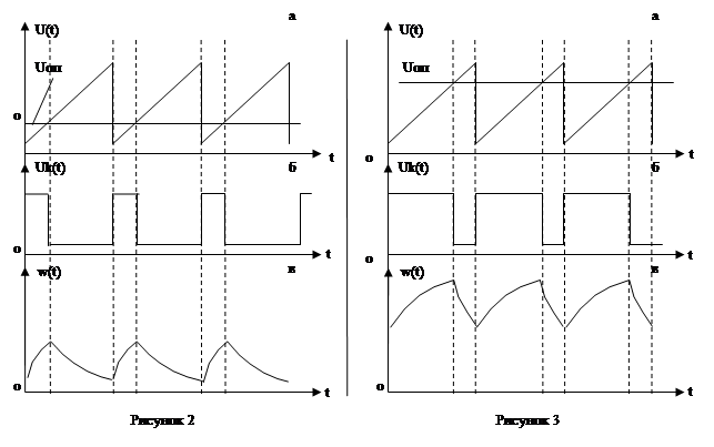 На данном рисунке ГЛИН - это генератор линейно изменяющегося напряжения. С помощью него создается частота следования импульсов. Диаграммы, иллюстрирующие работу устройства, изображены на рис.2,3. Схема работает следующим образом. ГЛИН подает импульсы на один из входов устройства сравнения - U