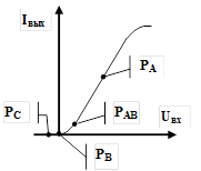 Рисунок 4.1. Сквозная характеристика усилительного каскада В усилителях используется несколько принципиально различных режимов его работы, называемых классами усиления. Для обозначения различных классов усиления употребляют прописные латинские буквы. Различают пять основных режимов работы усилительного элемента – А, В, АВ, С и D. Рассмотрим их подробнее. В режиме А рабочая точка (обозначена точкой РА на сквозной характеристике рисунка 4.1) выбирается на середине прямолинейного участка сквозной динамической характеристики. Возможно и иное расположение рабочей точки. Необходимо, чтобы амплитудные значения сигнала не выходили за пределы линейного участка сквозной характеристики. Выходной сигнал, в этом случае, практически повторяет форму входного сигнала при относительно небольшой величине последнего. Нелинейные искажения при этом минимальны. Ток в выходной цепи существует в течение всего периода входного сигнала. Среднее значение выходного тока велико по сравнению с амплитудой (или действующим значением) его переменной составляющей. Поэтому КПД усилительного каскада невысок – 20...30%[1] . В связи с этим режим усиления А используют лишь в маломощных каскадах (предварительных усилителях), для которых, как правило, важен малый коэффициент нелинейных искажений усиливаемого сигнала, а значение КПД не играет существенной роли. В режиме В рабочая точка выбирается так, чтобы ток через усилительный элемент протекал только в течение половины периода входного сигнала. Усилительный элемент работает с так называемой отсечкой. Углом отсечки принято называть половину той части периода, в течение которого проходит ток. При работе в режиме В угол отсечки q@ 90° (π/2). Ток покоя оказывается равным нулю, но форма выходного тока из-за нижнего изгиба сквозной характеристики искажается относительно входного даже в пределах проводящего полупериода. В кривой тока появляются высшие гармоники, что приводит к увеличению нелинейных искажений по сравнению с режимом А. Среднее значение выходного тока уменьшается, в результате чего КПД усилителя достигает 60...70%. В режиме С рабочая точка выбирается таким образом, чтобы угол отсечки оказался q < 90°. В этом режиме обеспечивается КПД до 80...85%. Однако высокий уровень линейных искажений существенно ограничивает применение его для усиления колебаний. Существует промежуточный режим АВ, когда рабочая точка выбирается на сквозной характеристике ниже, чем в режиме А, и выше, чем в режиме В (но все же ближе к режиму В, в начале линейного участка). Поэтому и показатели этого режима имеют промежуточное значение между режимами А и В – КПД 40...50% при невысоком уровне нелинейных искажений. В режимах АВ, В и С выходной ток имеет прерывистый характер. Поэтому для сохранения формы выходного сигнала обычно применяют двухтактные усилители, которые обеспечивают усиление как положительной, так и отрицательной полуволны входного сигнала. Особенности схемотехнического построения подобных каскадов будут рассмотрены дальше в разделе усилителей мощности. При резонансной нагрузке (например, высокодобротный резонансный контур радиопередатчиков) могут быть использованы и однотактные схемы. Наиболее часто в этом случае применяется режим класса С. Во всех рассмотренных ранее режимах работы максимальный входной ток, а, следов