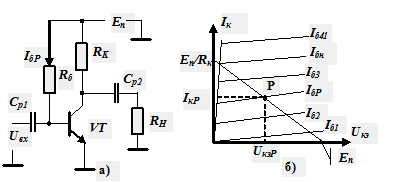 Рисунок 4.3. Усилитель с фиксированным током базы Для обеспечения режима работы класса А, необходимо установить соответствующие этому режиму токи электродов. Наиболее просто это получается, если задаться расположением рабочей точки, точки покоя, примерно на середине линии нагрузки (рисунок 4.3, б). Линия нагрузки данной схемы проводится в системе координат выходной характеристики пранзистора Uкэ и Iк через точки на осях координат Еп и Еп / Rк. Рабочая точка Р характеризуется коллекторным током IкР и напряжением на коллекторе UкэР. На основании выражения (4.1), с учетом используемых обозначений рисунка 4.3, имеем: Еп = URк + UкэР. Откуда, для получения выбранного распределения падений напряжений величина сопротивления