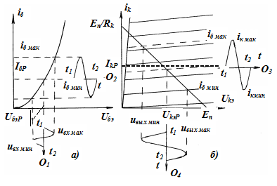 Рисунок 4.4. Прохождение сигнала во входной и выходной цепях Разделительные емкости Ср1 и Ср2 препятствуют проникновению постоянного напряжения источника питания в цепи источника сигнала Uвх и нагрузки Rн. Вместе с тем, они пропускают переменные составляющие сигнала. Пусть реактивное сопротивление ХС1 емкости Ср1 при самой низкой частоте входного сигнала значительно меньше входного сопротивления усилителя. В этом случае практически весь входной сигнал пройдет через емкость, что приведет к изменению напряжения базы транзистора. Начнет изменяться и ток базы. Чтобы отобразить этот процесс на рисунке 4.4, а проведены две оси времени О1 и О2. До момента t1 напряжение и ток базы определяются постоянным напряжением источника питания. Поступающий переменный сигнал амплитудой Uвх приводит к изменению тока базы в пределе от iб мин до iб мак. На рисунке показан один период изменения сигнала за время от t1 до t2. Согласно с изменением тока базы будет изменяться ток и напряжение коллектора. При этом точка, соответствующая изменяемому значению тока базы, будет перемещаться по линии нагрузки (рисунок 4.4, б) в пределах, определяемых токами базы iб мин и iб мак. Изменения тока и напряжения коллектора во времени отображены на осях О3 и О4. При отсутствии выходной характеристики используемого транзистора, измененные значения тока коллектора можно определить из выражений iк мак = h21Э iб мак; iк мин = h21Э iб мин,(4.7) а значения напряжения на коллекторе транзистора: Uкэ мин = Еп – Rн iк мак; Uкэ мин = Еп – Rкэ iк мин. (4.8) Изменение напряжения на коллекторе транзистора является источником изменения напряжения в нагрузке: переменная составляющая проходит через второй разделительный конденсатор С1Р и появляется на сопротивлении нагрузки. Если реактивное сопротивление ХС2 емкости Ср2 при самой низкой частоте входного сигнала значительно меньше эквивалентного сопротивления нагрузки Rнэ,