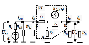 Рисунок 4.12. Эквивалентная схема усилителя ОК На схеме штриховой линией изображено выходное сопротивление источника питания Rи. Как было указано ранее, оно незначительно и им пренебрегают. Поэтому коллектор транзистора оказывается заземленным, т.е. он является общим для входной и выходной цепи. Что и объясняет наименование усилителя (усилитель ОК), хотя из рисунка 4.11, а этого явно не видно. По сравнению с предыдущими схемами делитель в цепи базы представлен своим эквивалентным сопротивлением Rд, которое вычисляется выражением: